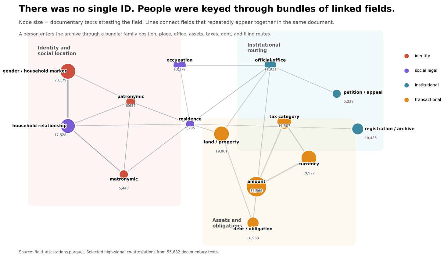 So the papyri showed people as bundles of relations and obligations. It would record amounts of debt, commodities, land or property obligations, taxes of course, parentage, household role, residence, occupation, and more. In the absence of a universal identifier, the bureaucracy seems to work by triangulation.