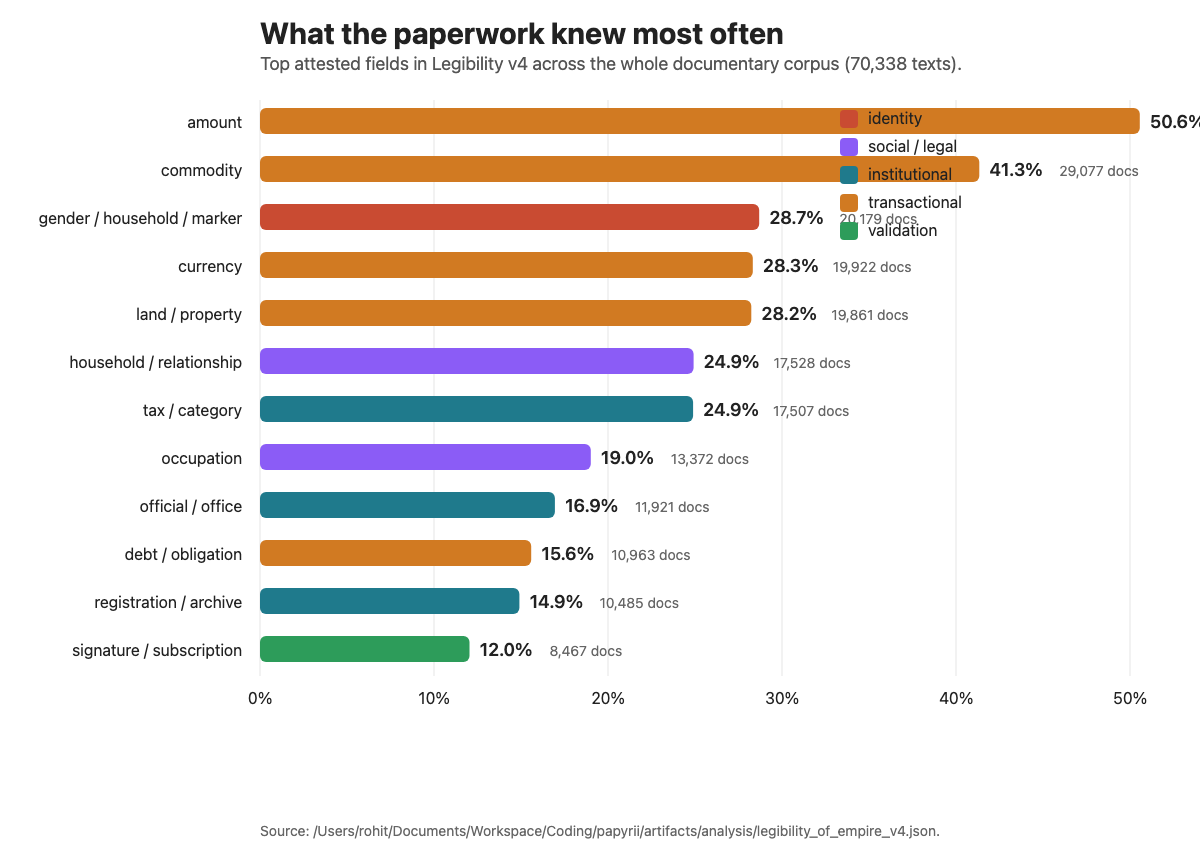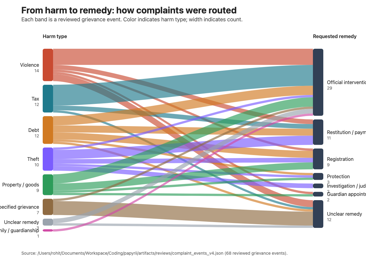 First, the data. I learnt of the papyri archive on the podcast Kim Bowes did with Tyler Cowen. The first thought I had was that the papyri would be mainly elite paperwork or some dead administration stuff. But the archive is not exactly that, but it is not a record of everyone either. It is a record of people who became legible when their lives the state bureaucratic apparatus for some reason.
