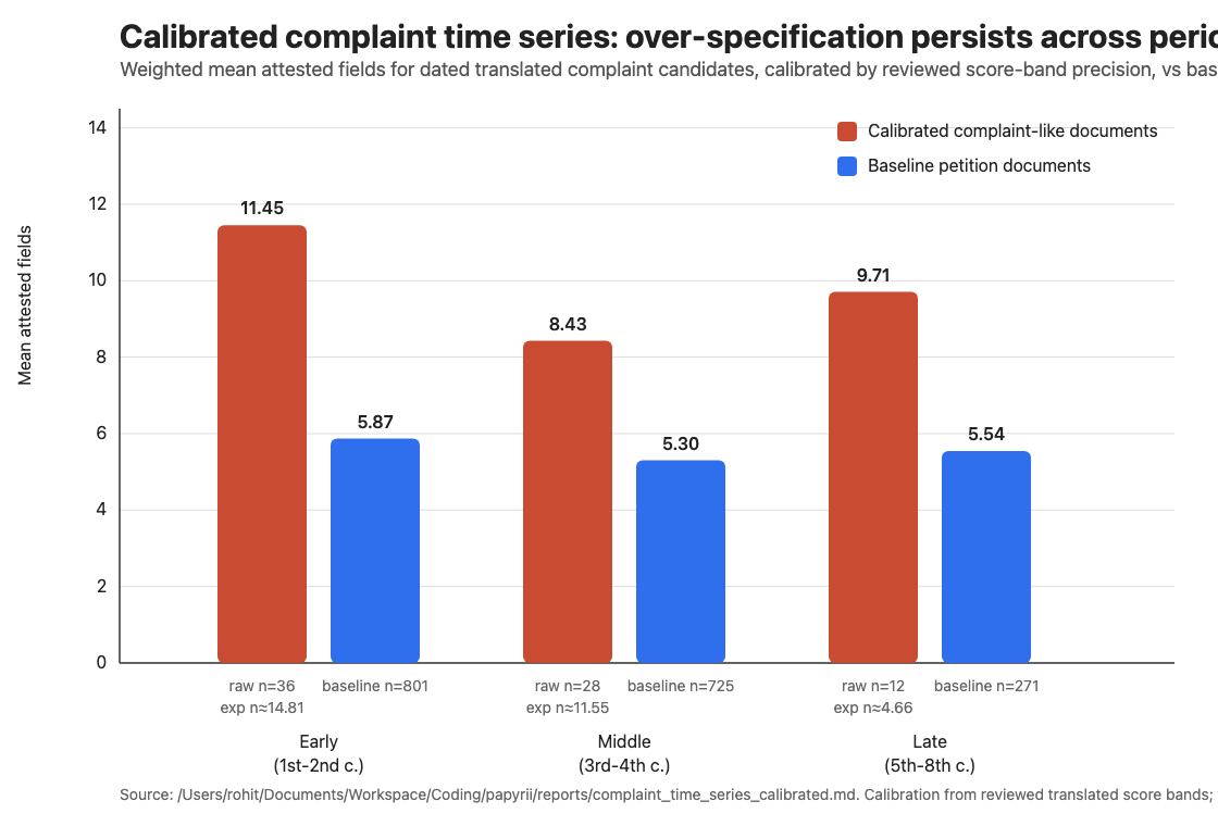 And turns out, in the periods where I could compare them, complaint-like documents carried about 2x as many attested fields as ordinary petitions from the same periods. Complaints are way more overspecified. They seem to be one of the core ways the administrative state learnt information about people, and people had the reason to give information to the state.