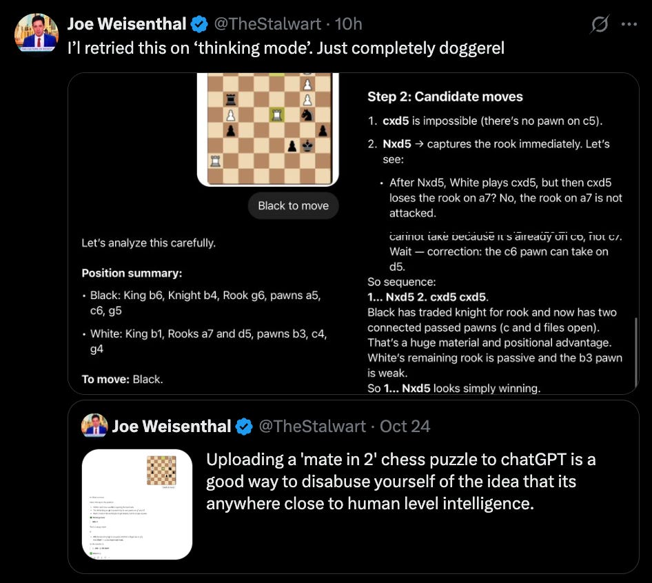 An aside, but considering the topic I couldn’t resist. The constant use, including in this essay, about words like “reasoning” or “consciousness” or “thinking” or even “trying to answer” are all ways in which we delude ourselves a little bit about what the models are actually doing. Semantic fights are the dumbest fights but we, just like the functionalists, look at what the model gets right and how it does and are happy to use the same terms we use for each other. But what they get wrong are where the interesting failures.