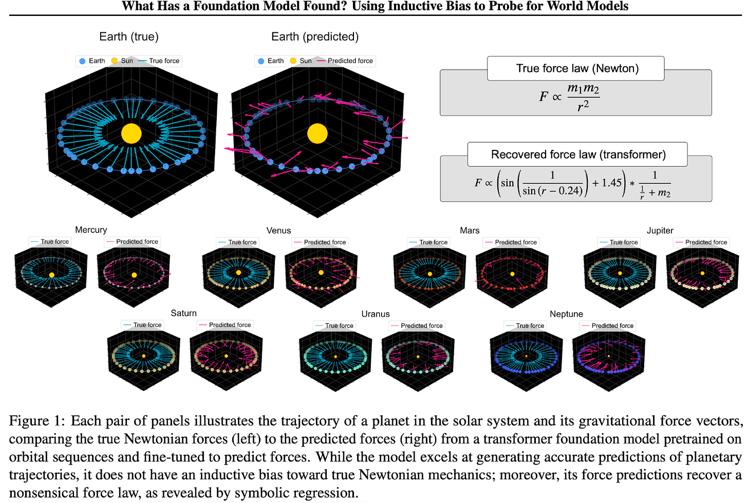 There have been other similar attempts. This paper, what has a foundation model found, in particular was fascinating because it tried to use a similar method to see if you could predict orbits of planets based only on observational data. And the models managed to do it, except they all tried to approximate instead of learning the fundamental underlying generative path4.