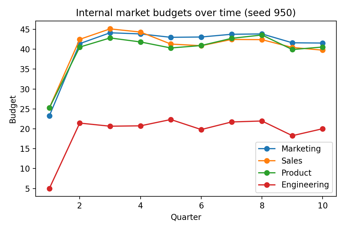 The first way to test these was to just throw them into a simulated company and see what happened. So I set up four departments - Marketing, Sales, Engineering and Support - and said they could all bid for budget to do their jobs. Standard internal capital market where departments would submit bids and projects get funded until budgets get exhausted.