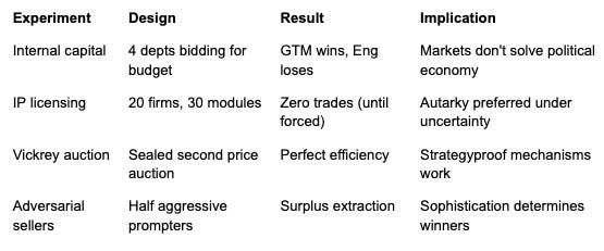 The Coasean Singularity paper argues AI lowers transaction costs but the gains require alignment and mechanism design, which is what I empirically tested here. It’s a strong confirmation of its strong form - that reduction in transaction costs was nice but mechanism design was needed to set up an actual market.