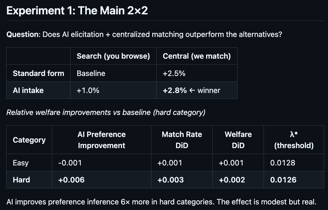 That’s what we sought to test with our experiments. The question being, could we figure out how and whether LLMs can help in matching markets where preferences are “hard to describe”? Can LLMs actually elicit the dispersed, hard-to-articulate preferences better than standardised methods? And if they can, what happens when LLM-based agents are available to everyone in the market?