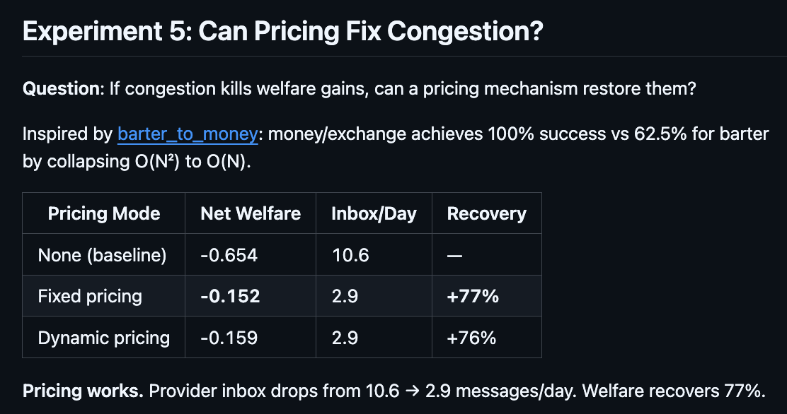 Pricing works! As shown in Figure 5, most of the welfare gains are recovered and the congestion issues are resolved. LLMs may lower the cost of expressing dispersed knowledge, but they don’t remove the need for institutional design to manage externalities. At least in our experimental simulation, the price system remains essential to solve the issue of complexity and congestion.