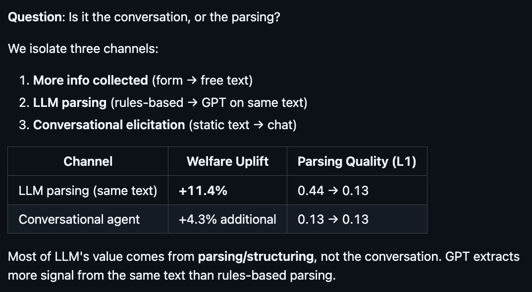 We thought the AI agents’ ability to ask follow-up questions would be the game-changer. Turns out though (see Figure 3), most of the value comes from the AI agent simply inferring more signal from messy text compared to the signal in a rule-based parser. This is consistent with the work of Manning et al. that we discussed above. This may of course be something specific to our prompts—perhaps one could obtain further gains by explicitly instructing the AI agents to engage in structured back-and-forth with the customers, and to do so in contexts where this would be helpful, but this was not the case here.