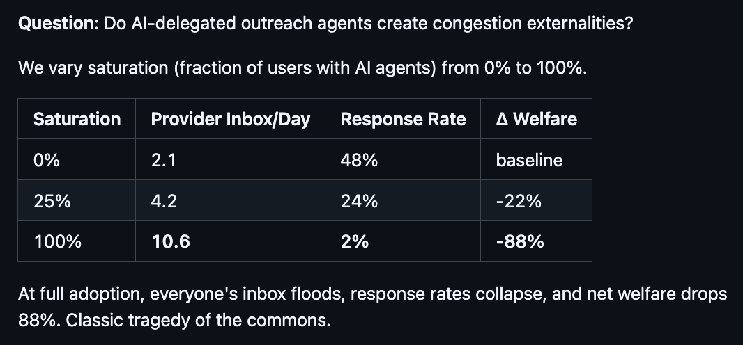 So as you increase the number of customers with AI agents, the level of congestion rises significantly. Each customer agent sends a query to a provider agent’s inbox and it has to respond. Responding to all those agents takes a lot of compute. Here is what happens in our simulation (Figure 4): At full adoption, the providers’ inboxes flood with 5x the amount of requests, response rates collapse from 48% to 2%, and net welfare drops 88%.