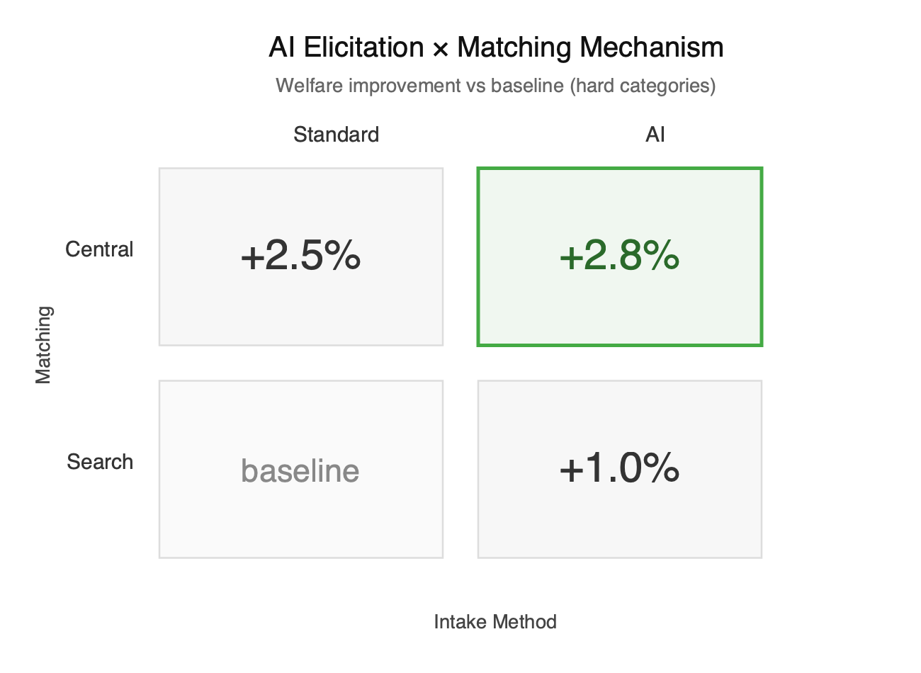 Second, as shown in Figure 2, AI-based elicitation changes what type of market design works best, and the conditions under which centralised matching can beat search.