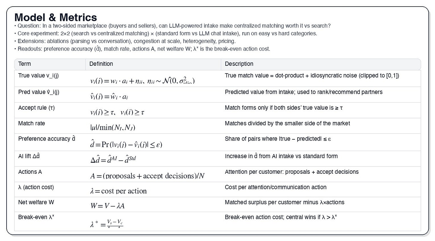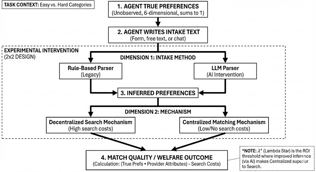 The experimental intervention targets the preference-inference pipeline: how customer preferences get translated into data the platform can act on. The experiment varies the intake method (standard structured forms versus free-text descriptions parsed by an LLM) crossed with the matching mechanism (decentralised search where customers browse and choose, versus centralised assignment where the platform matches algorithmically). Match quality is computed as the dot product of the customer’s true preference weights and the matched provider’s attributes, minus any search costs incurred. All of this is summarised in Figure 1 below.